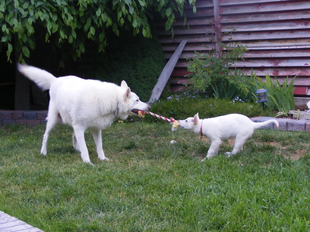 This is Snow the first day we brought her home on the left, 6 weeks later she has tripled her weight, her ears are straight up, she is house broken, no longer chews on the furniture, prefers rawhide bones, weighs just about 28 lbs, and the Veterinarian we took her to says she has a great bone structure, very healthy puppy, who will be quite large.